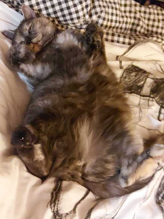 Kat entspannt im Bett, sie hat sich ihren Ruhestand auch redlich verdient:-)
